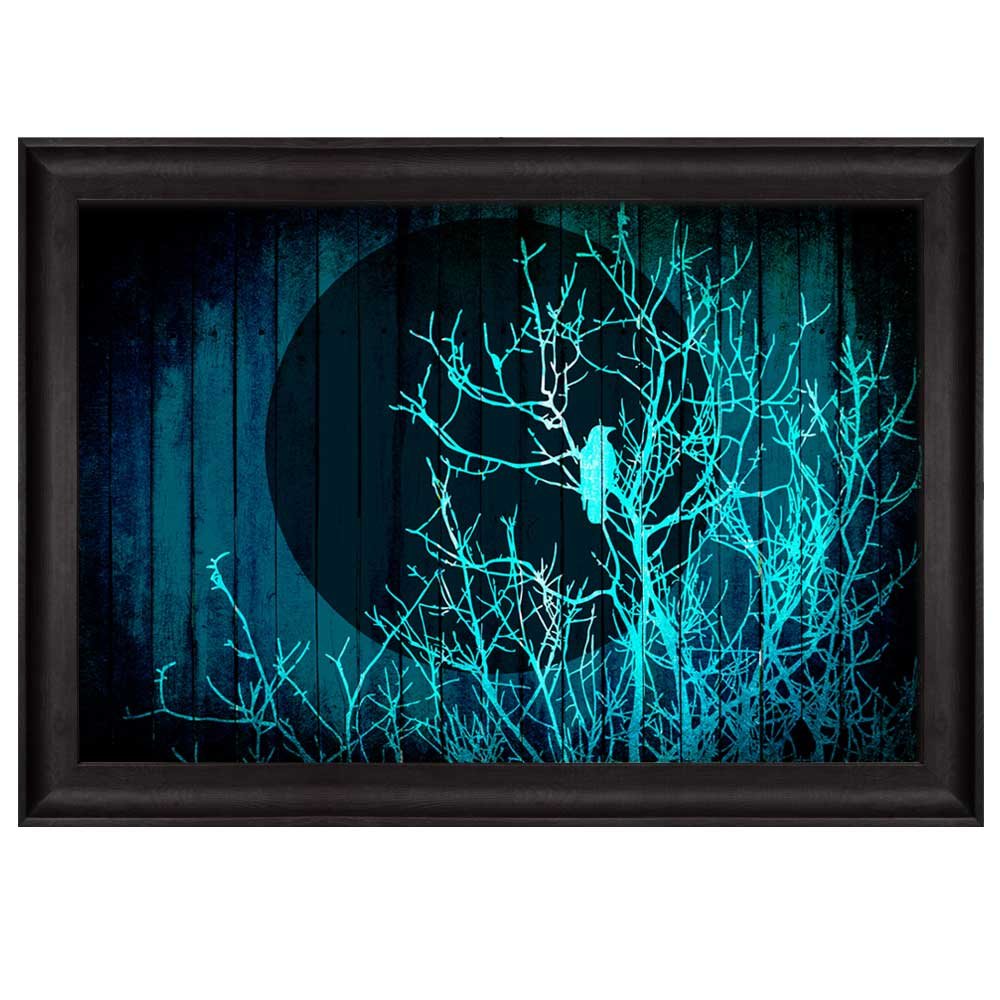 Illustration of The Blue Silhouette of a Tree with a Crow Under The Moonlight Over Teal Wooden Panels Nature Framed Art