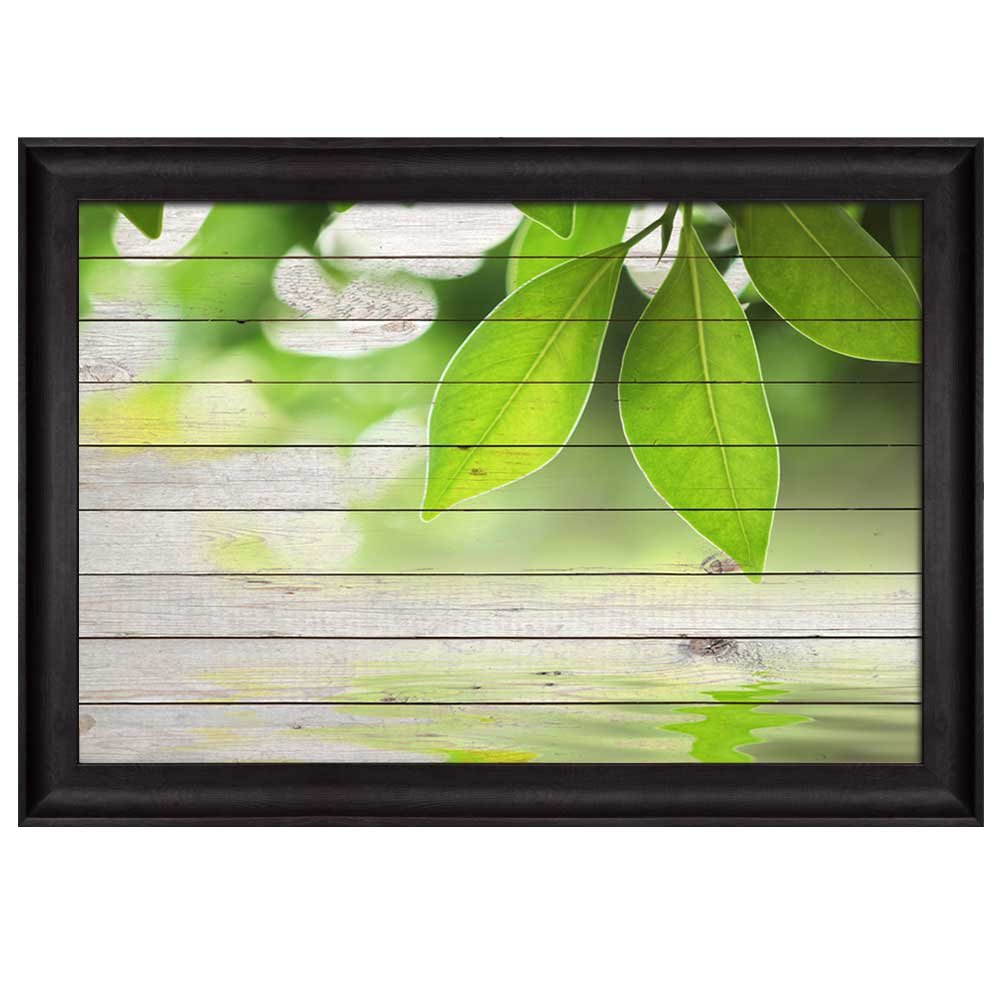 Leaf Branches at The Top Over Green Wooden Panels Nature Framed Art