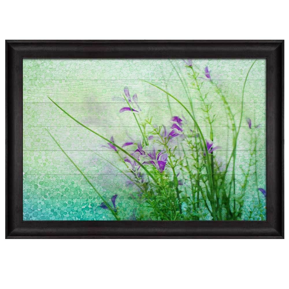 Small Purple Flowers with Blue and Green Circles Along with Branches with Leaves Over Wooden Panels Nature Framed Art