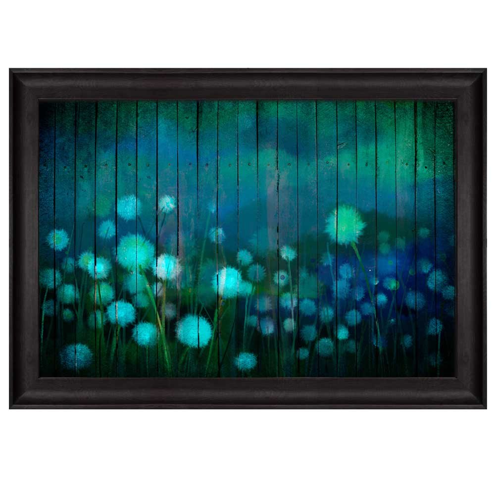 Water Painting of a Field with Dandelions Over Teal Wooden Panels Nature Framed Art
